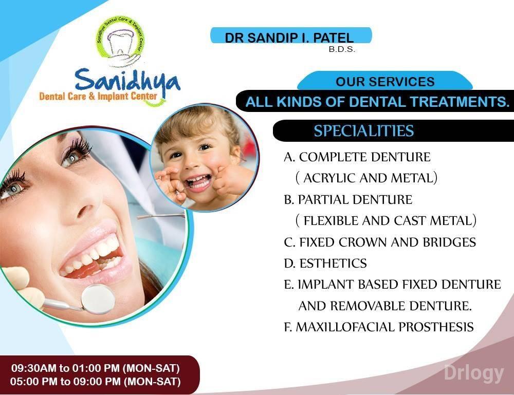 Sanidhya Dental Clinic is Well Known clinic located at Gota, Ahmedabad. Established in the year 2010. Sanidhya Dental Clinic is visited by top doctors like Dr. Sandip Patel (Dentist).