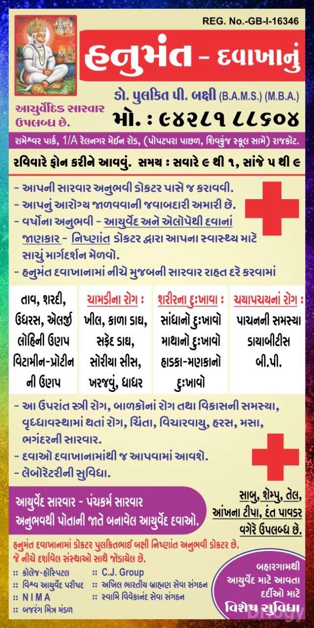 Hanumant Clinic is Well Known clinic located at Railnagar, Rajkot. Established in the year 2009. Hanumant Clinic is visited by top doctors like Dr. Pulkit P. Baxi (Ayurvedic).