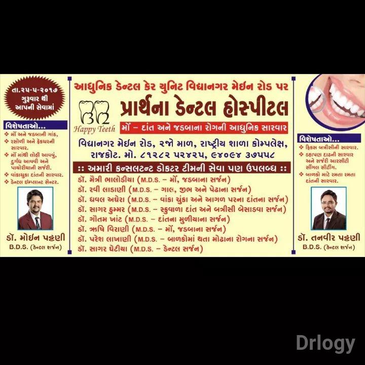 Prarthana dental hospital is Well Known 1 beds Multispeciality hospital located at Vidhya Nagar Main Road, Rajkot. Established in the year 2017. Prarthana dental hospital is visited by top doctors like Dr. Moin patani (Dentist).